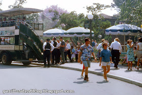 I have two photos from 1962, starting with this fun shot taken in the Plaza on a hazy (smoggy) October day. The crowds are not bad, but there's still enough hustle and bustle! Two details I enjoy are the one of the peaks of the Tiki Room building, and the Swiss Family Treehouse (appearing a delicate pink in this chunky atmosphere).