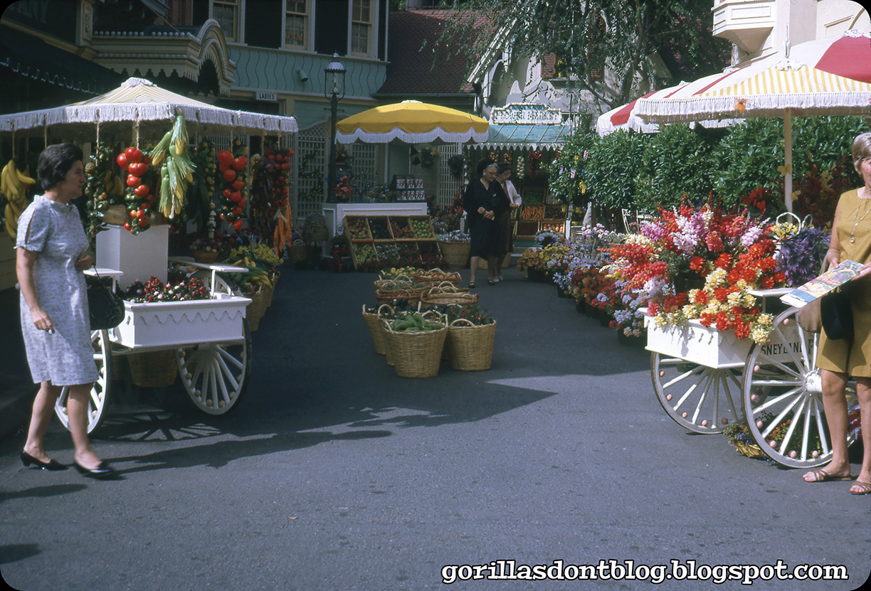 This first one is an unusual view, looking eastward (but not Squidward) toward the Plaza Inn, with the entrance to Tomorrowland barely visible to the left, along with hints of Peoplemover and sandalwood. Business is booming at the popcorn cart, requiring two straw-hatted employees, each of whom is suffering from various degrees of "popcorn elbow". There's just something enjoyable about this view of people walking hither (but not thither, never thither) on a cool gray day.